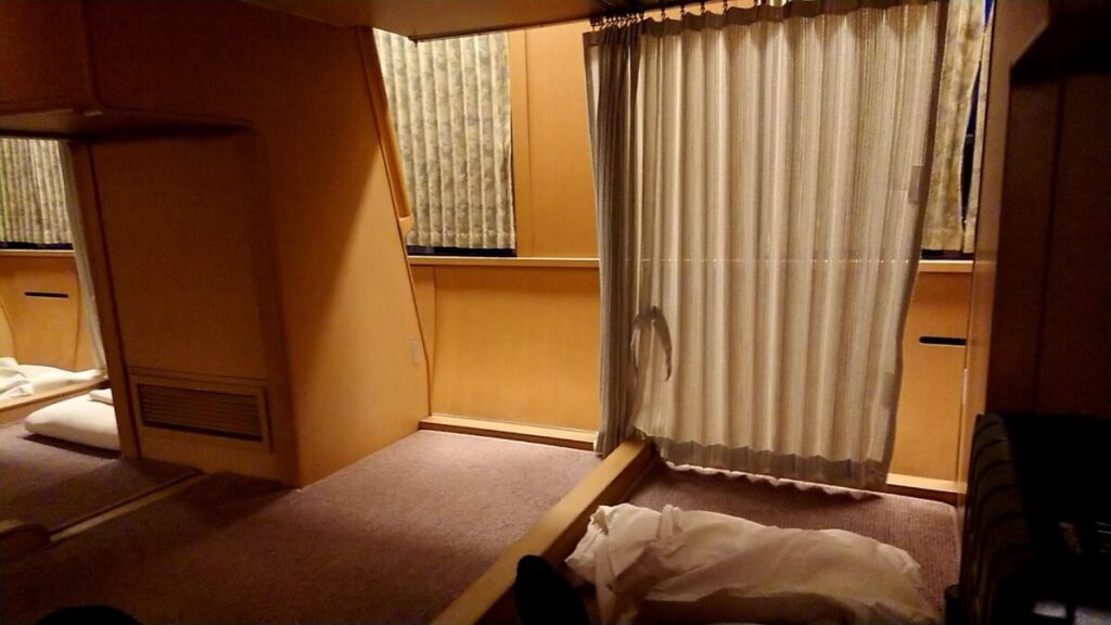 今回は個室が取れず初の「ノビノビ座席」。頭の部分はかろうじて仕切られていますが、基本的には雑魚寝。床も固く昔の長距離フェリーの2等室を思い出します。
