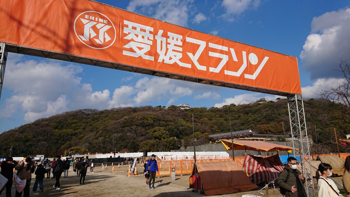 運よく当選し2年連続の出走となった愛媛マラソン。前年は残り数十秒でのギリギリゴールだっただけに今回は余裕のゴールをしたいところ、でしたが・・・・